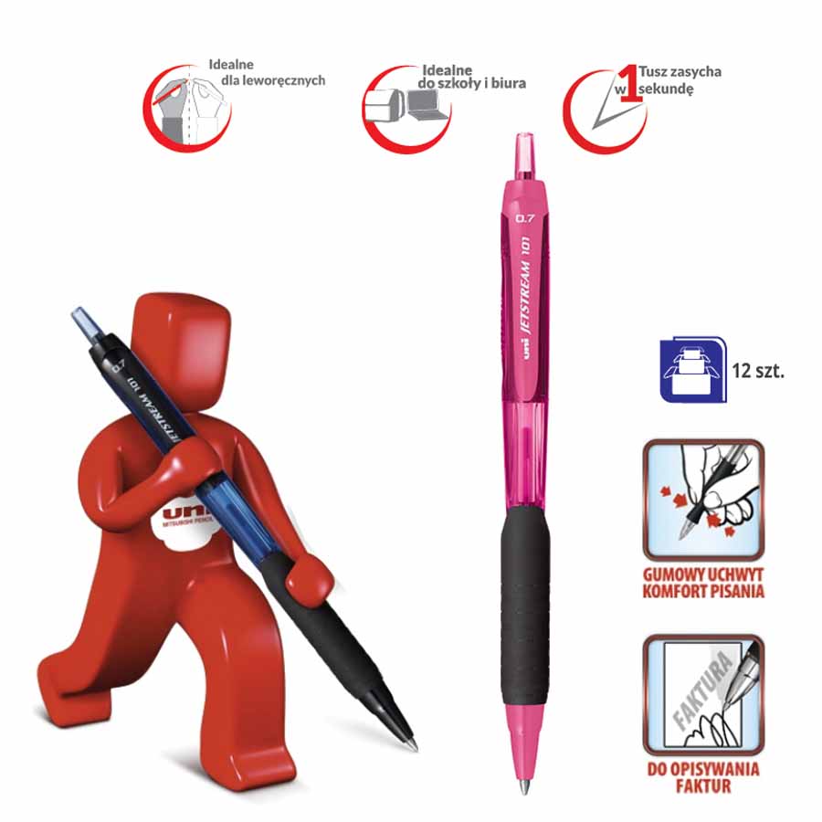 Długopis posiada ergonomiczną obudowę z antypoślizgowym uchwytem, co gwarantuje komfort i pewność pisania nawet przez dłuższy czas. Doskonale leży w dłoni, minimalizując zmęczenie.