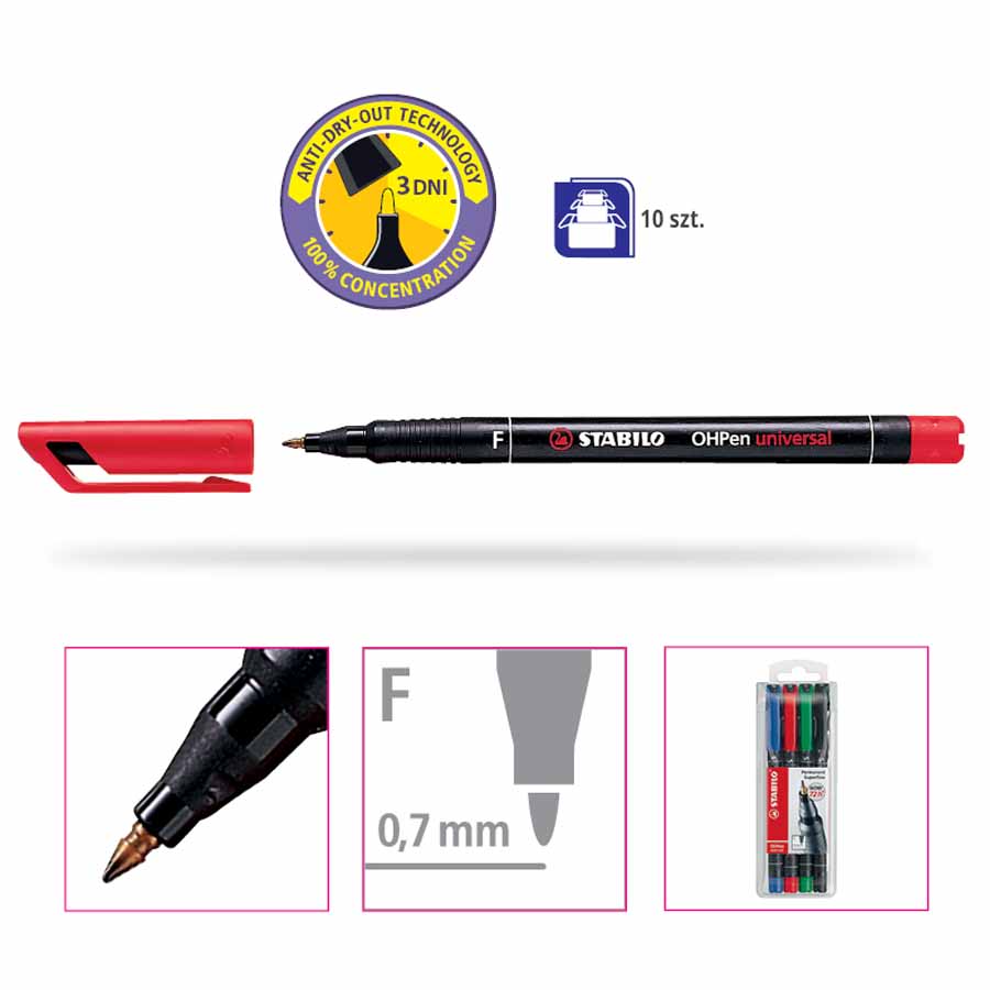 Tusz w foliopisie Rystor F schnie szybko, nie rozmazuje się, jest wodoodporny i odporny na działanie promieni słonecznych. Dzięki temu oznaczenia są trwałe i wyraźne, a intensywność barw pozostaje niezmieniona.