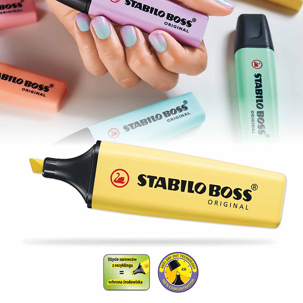 STABILO BOSS ORIGINAL dba o środowisko - wszystkie czarne elementy zakreślacza wykonane są z plastiku pochodzącego z recyklingu. Zakreślacz jest również łatwy do ponownego napełnienia, co redukuje ilość odpadów.