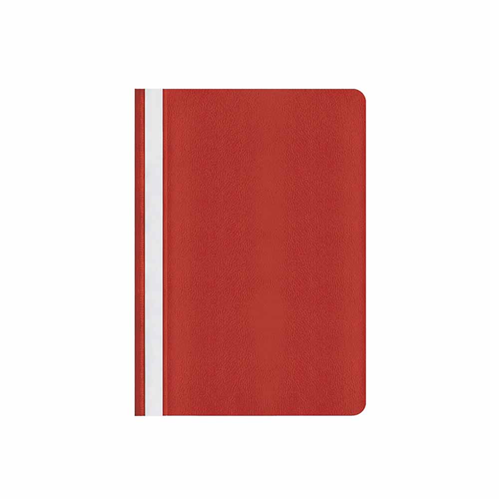 Skoroszyt wyposażony jest w wymienny, papierowy pasek do opisu, który ułatwia identyfikację zawartości. Dwa wycięcia umożliwiają szybkie i łatwe wysuwanie paska, co dodatkowo poprawia funkcjonalność. Zaokrąglone rogi obu okładek zwiększają komfort użytkowania i zapobiegają uszkodzeniom innych dokumentów.