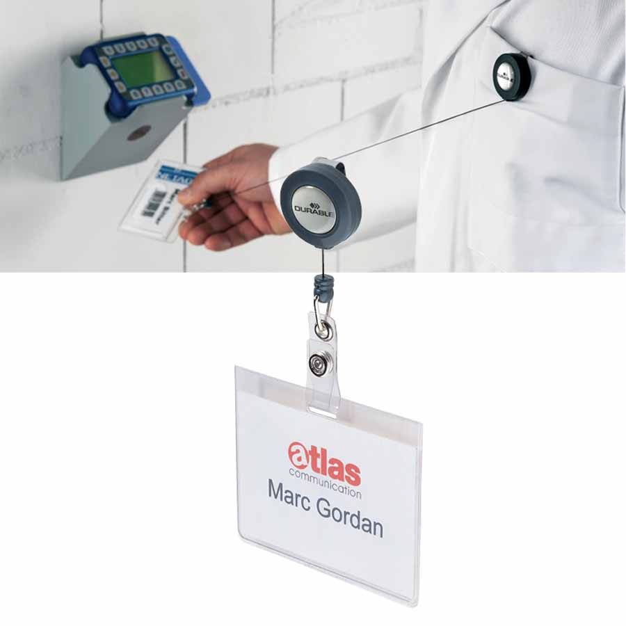 Mechanizm ściągający Durable oferuje długość około 80 cm po rozciągnięciu, co zapewnia swobodny dostęp do identyfikatora bez konieczności jego zdejmowania. To wygodne rozwiązanie sprawia, że Twój identyfikator jest zawsze pod ręką, gotowy do użycia w każdej chwili, co jest niezwykle przydatne w dynamicznym środowisku pracy.