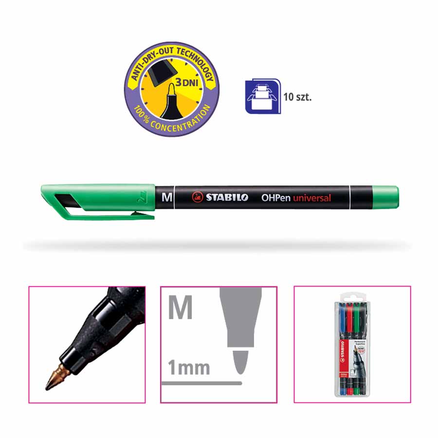 Foliopis STABILO OHPen M jest niezwykle wszechstronny, idealny do pisania na szkle, torebkach foliowych, etykietach, zdjęciach, błyszczącym papierze, płytach CD oraz zdjęciach rentgenowskich. Jego uniwersalność sprawia, że jest niezastąpiony w wielu sytuacjach.