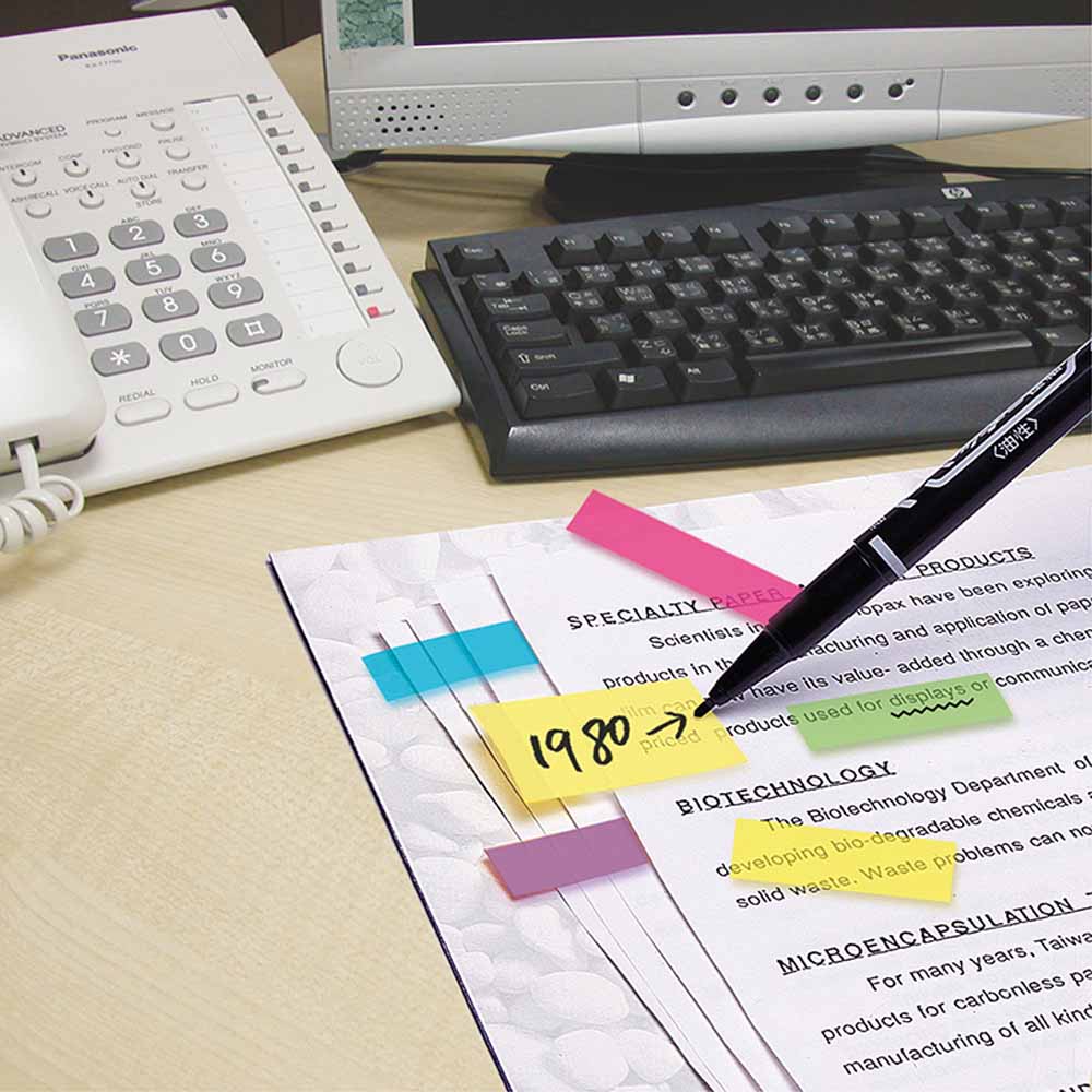 Neonowe kolory zakładek dodają energii i ułatwiają kategoryzowanie oraz segregowanie notatek, co znacznie poprawia organizację pracy. Zakładki są półprzezroczyste, dzięki czemu nie zasłaniają tekstu, a jednocześnie wyraźnie go podkreślają. Można je wielokrotnie odrywać i przyklejać w różnych miejscach, co zwiększa ich funkcjonalność i czyni je niezastąpionym narzędziem w pracy biurowej, szkole i codziennym życiu.