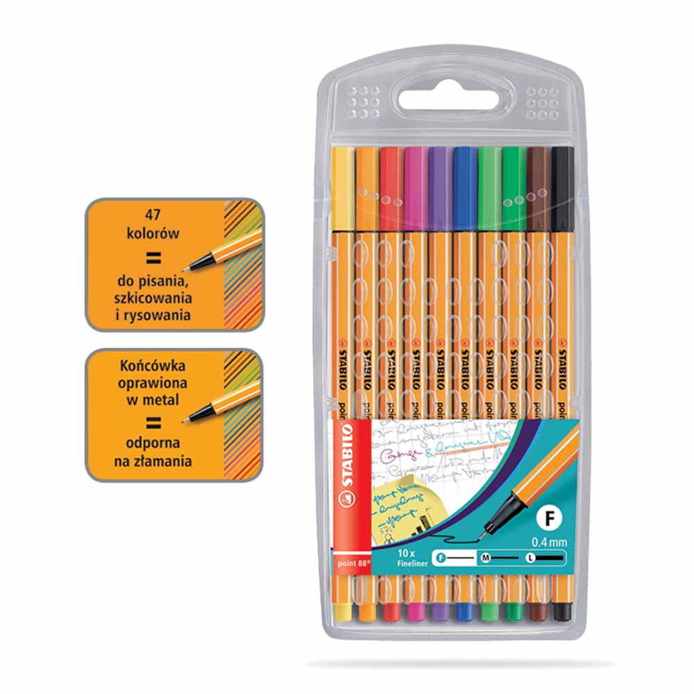 Elementy obudowy cienkopisu są w kolorze tuszu, co ułatwia jego identyfikację. Tusz na bazie wody jest bezpieczny i ekologiczny, zapewniając jednocześnie intensywne i trwałe kolory.