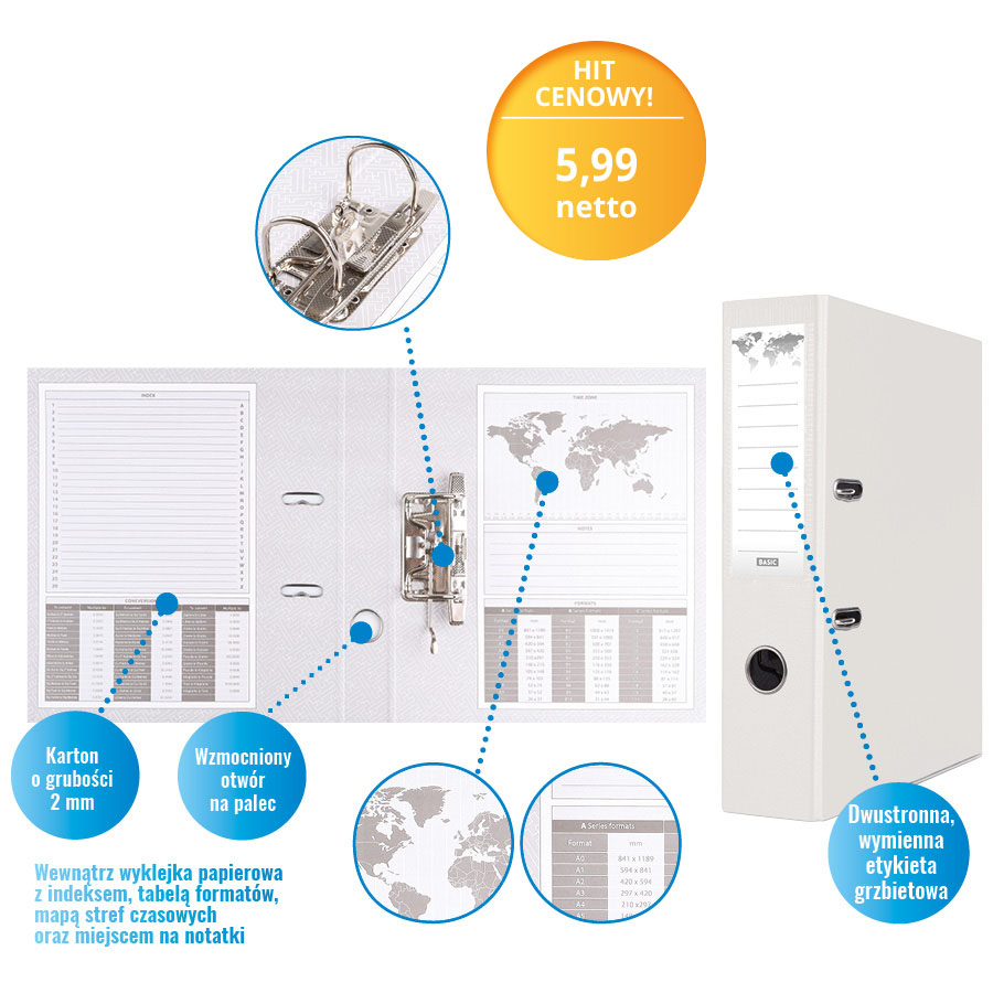 • z metalową blaszką skoroszytową oraz 4 dziurkami umożliwiającymi wpięcie wąsów do segregatora