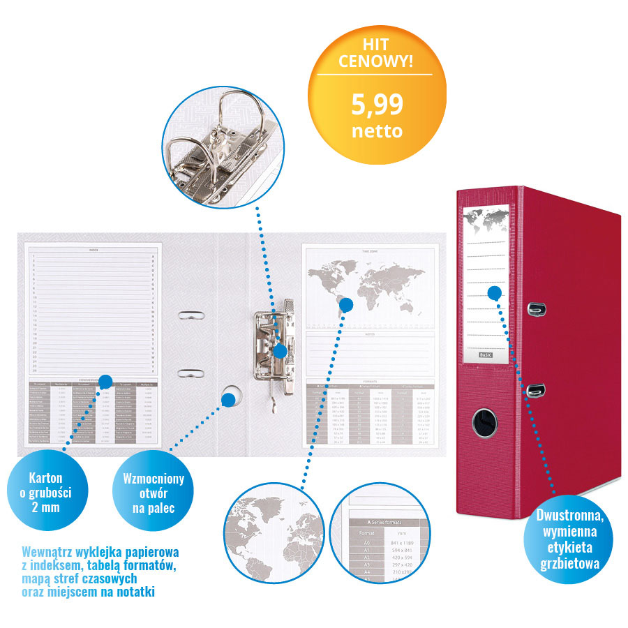 Wewnątrz znajduje się papierowa wyklejka z przydatnymi informacjami, takimi jak indeks, tabela formatów, mapa stref czasowych oraz miejsce na notatki. Dodatkowe udogodnienia to dolna listwa wzmacniająca, wzmocniony otwór na palec oraz dwustronna, wymienna etykieta grzbietowa, ułatwiająca identyfikację zawartości.