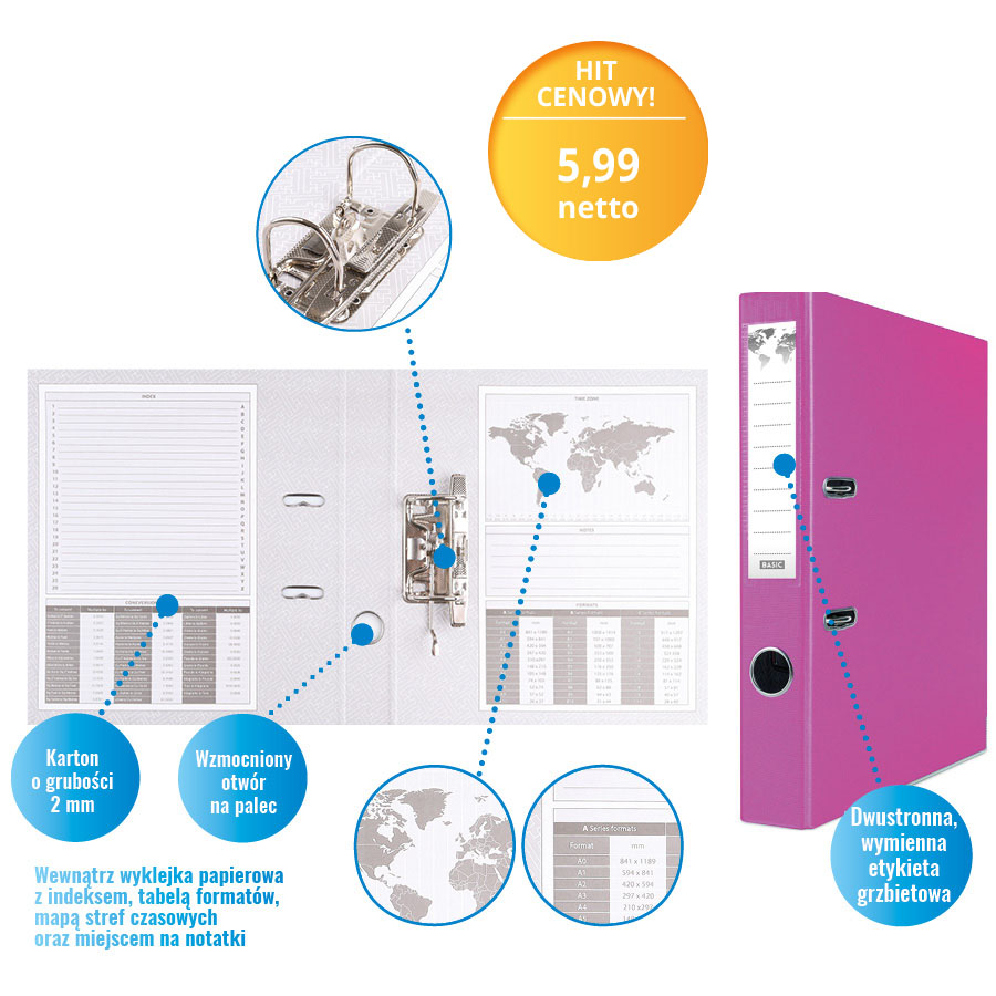 Wewnątrz znajduje się papierowa wyklejka z przydatnymi informacjami, takimi jak indeks, tabela formatów, mapa stref czasowych oraz miejsce na notatki. Dodatkowe udogodnienia to dolna listwa wzmacniająca, wzmocniony otwór na palec oraz dwustronna, wymienna etykieta grzbietowa, ułatwiająca identyfikację zawartości.