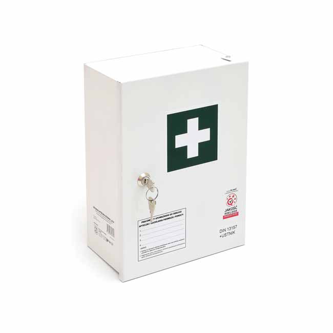 wyposażenie do apteczek zgodne z normą DIN 13157 rozszerzone o aparat do sztucznego oddychania wyroby medyczne oznakowane znakiem CE termin ważności produktów sterylnych wynosi 5 lat zawartość: - plaster na szpulce 5m x 2,5cm – 1 szt. - zestaw plastrów (5 rodzajów) – 42 szt./1 opak. - bandaż z kompresem (opatrunek indywidualny) 6cm x 8cm – 1 szt. - bandaż z kompresem (opatrunek indywidualny) 8cm x 10cm – 3 szt. - bandaż z kompresem (opatrunek indywidualny) 10cm x 12cm – 1 szt. - chusta opatrunkowa 60cm x 80cm – 1 szt. - kompres na rany 10cm x 10cm – 6 szt./3 opak. - kompres na oko 5cm x 7,5cm - 2 szt. - zimny kompres – 1 szt. - koc termiczny (ratunkowy) 210cm x 160cm – 1 szt. - bandaż elastyczny 4m x 6cm – 2 szt. - bandaż elastyczny 4m x 8cm – 2 szt. - chusta trójkątna 96cm x 96cm x 136cm – 2 szt. - nożyczki – 1 szt. - worek foliowy – 2 szt. - chusta z fizeliny 20cm x 30cm – 5 szt./1 opak. - chusteczki nasączone – 4 szt. - rękawice jednorazowe - 4 szt. (2 pary) - maska medyczna – 2 szt. - instrukcja udzielania pierwszej pomocy – 1 szt. - aparat do sztucznego oddychania