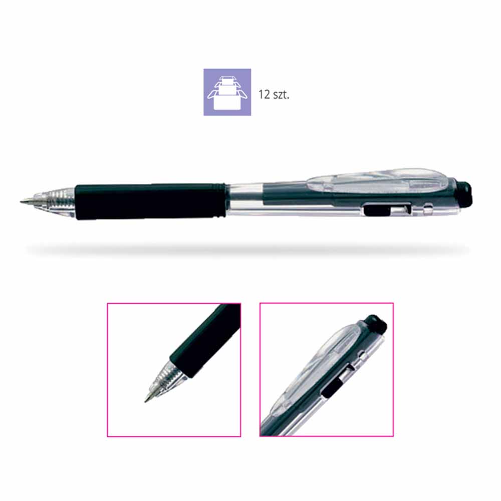 Długopis wyposażony jest w boczny system chowania wkładu, co zwiększa wygodę użytkowania i chroni wkład przed przypadkowym wysunięciem. To nowoczesne rozwiązanie zapewnia większą kontrolę nad długopisem i jego funkcjonalnością.