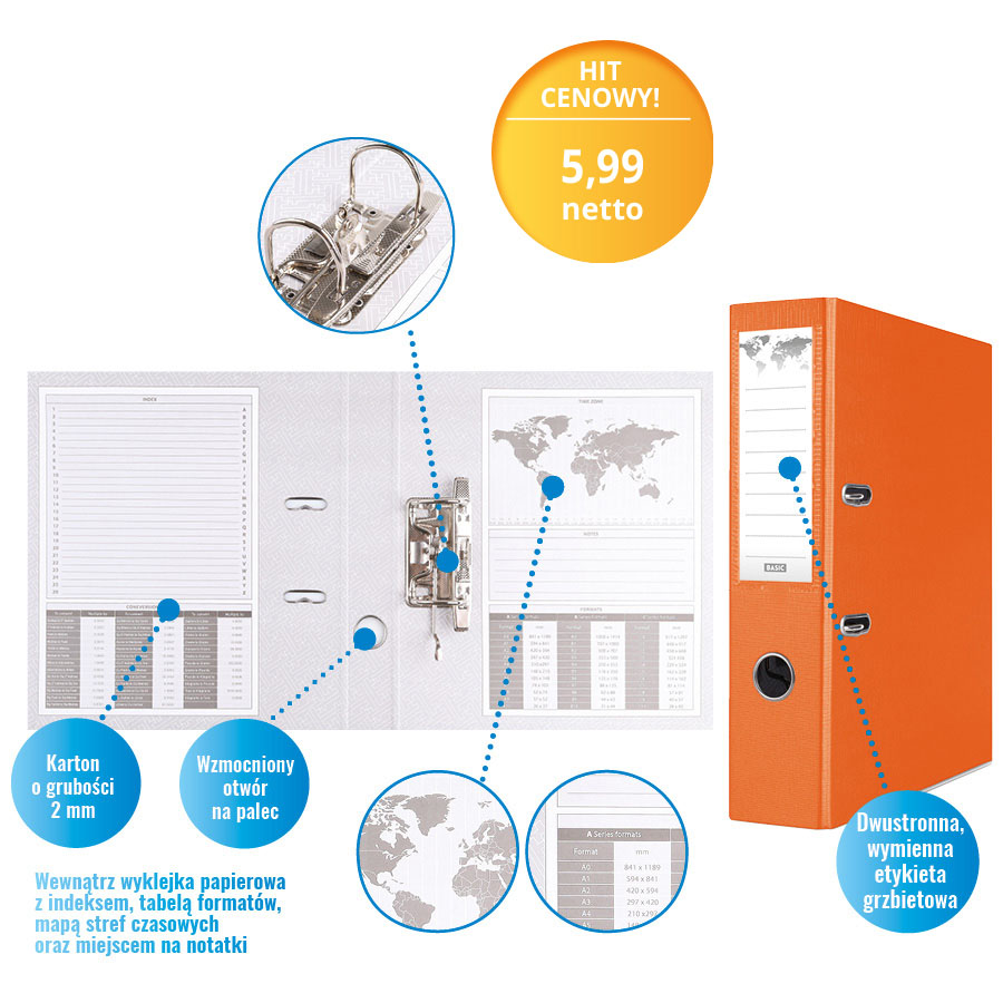 • z metalową blaszką skoroszytową oraz 4 dziurkami umożliwiającymi wpięcie wąsów do segregatora