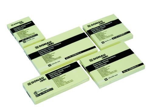 uniwersalne karteczki, w żółtym neutralnym kolorze, idealne do przekazywania wiadomości ilość karteczek: 1x100 w rozmiarze 38x51mm gramatura: 70gsm klej umieszczony wzdłuż dłuższego boku klej usuwalny za pomocą wody bloczki można wielokrotnie przyklejać i odklejać wykonane z papieru (100% pulpa drzewna) posiada transparentny pasek odrywający kolor jasnożółty